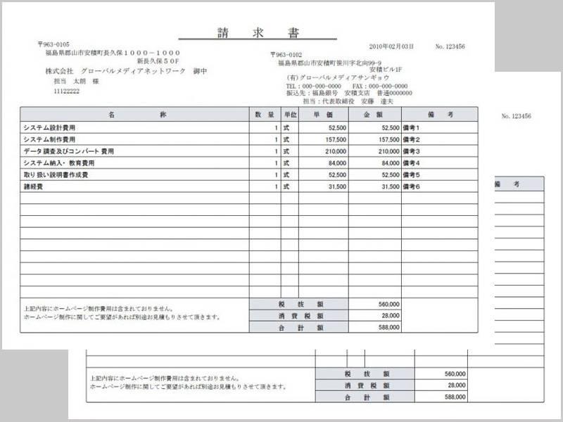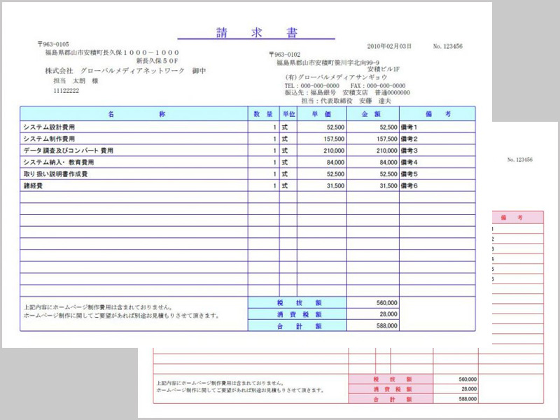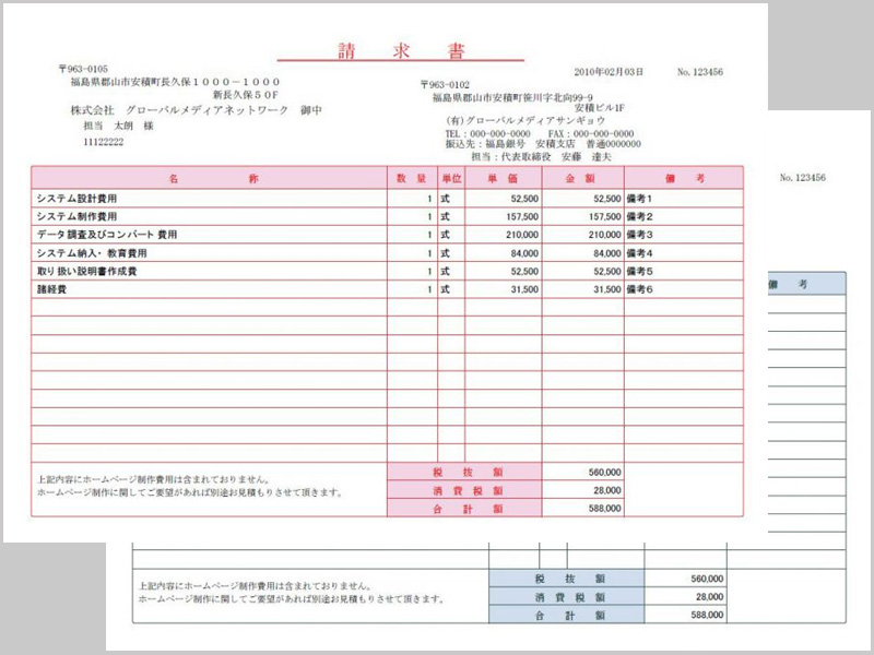 納品書や請求書などのタイトルが変更可能です。金額の計算等は自動で行います。 「納品書」と「請求書」、「納品書」と「受領書」なと2種類の帳票が、複写形式で2枚作成する事が出来ます。勿論、帳票一枚だけの作成も可能です。