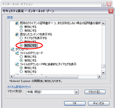 上記画面において「レベルカスタマイズ」をクリックすると左図のような設定画面に変わりますので、そこで下の方に「混在したコンテンツを表示する」と云う項目がありますので、その項目を「有効にする」に変更して「OK」ボタンをクリックして下さい。これで設定は終了となります。
