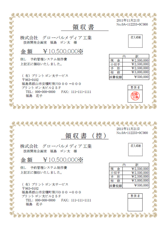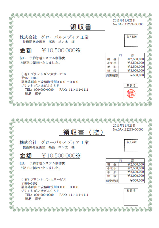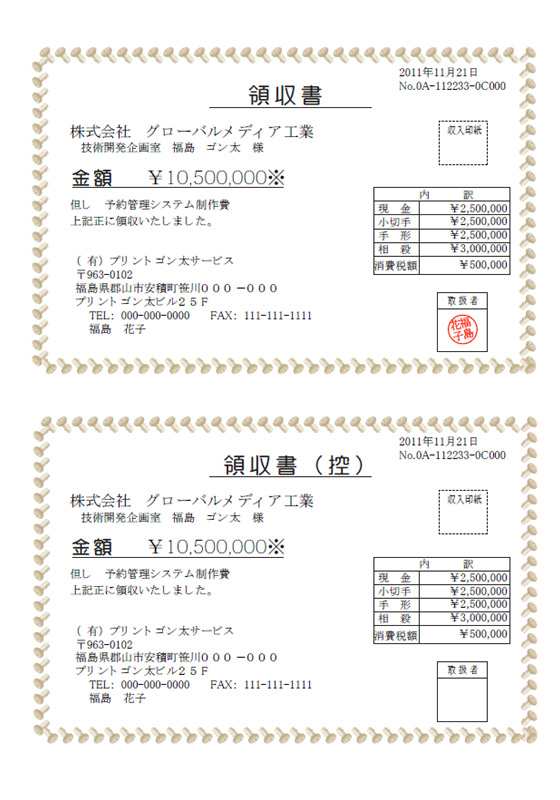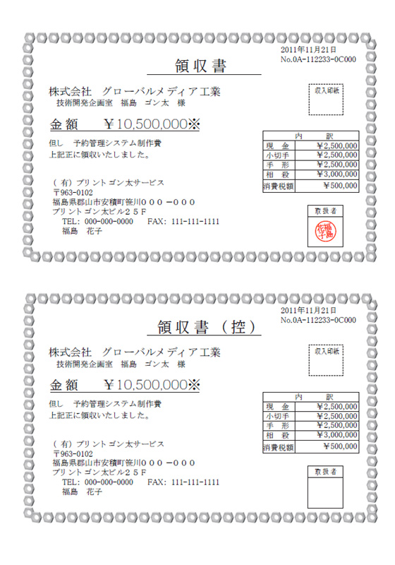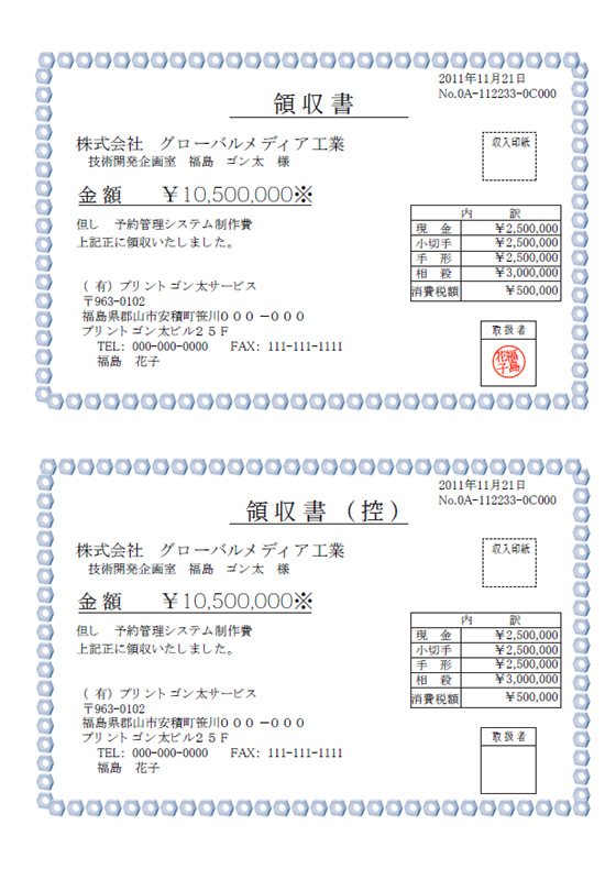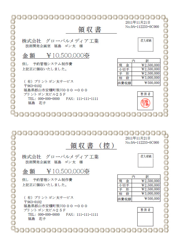 領収書をPDFにて作成します。(現金、小切手などの内訳付き)