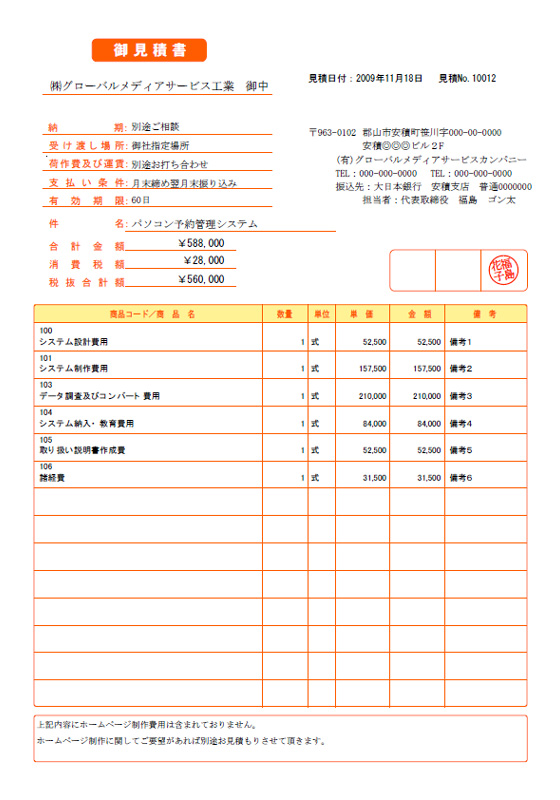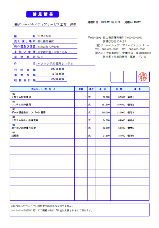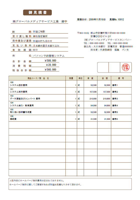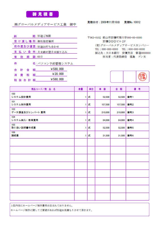 見積書をPDFで作成します。金額の計算等は自動で行います。