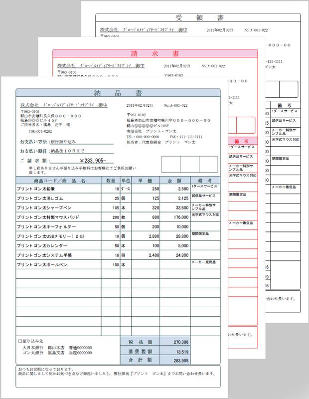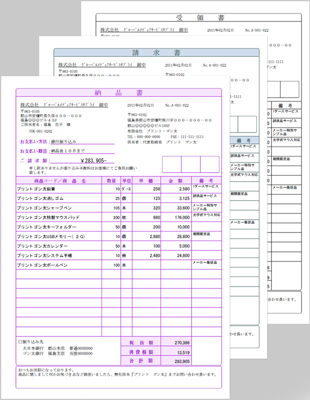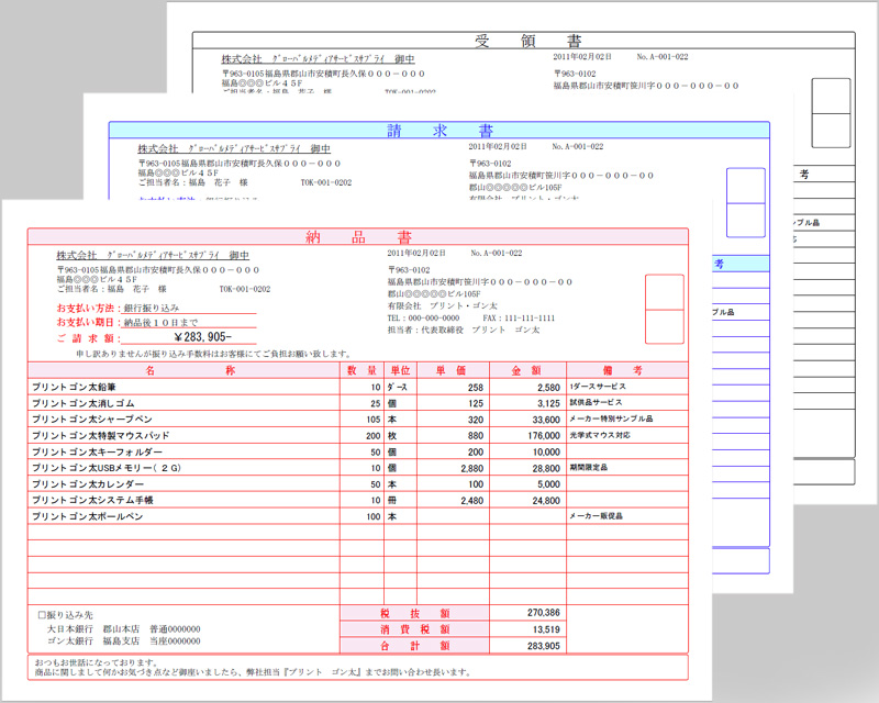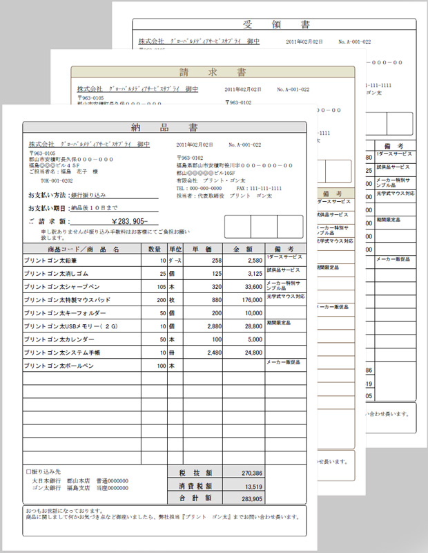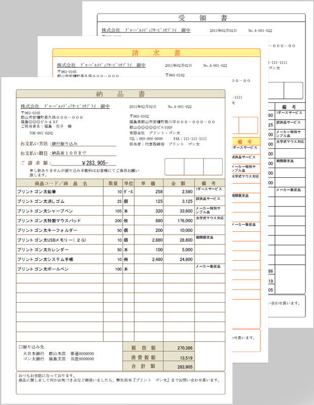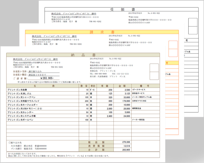 各帳票の名称は自由に設定出来ますので、納品書」・「請求書」・「受領書」などが制作可能です。