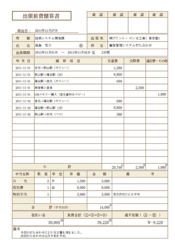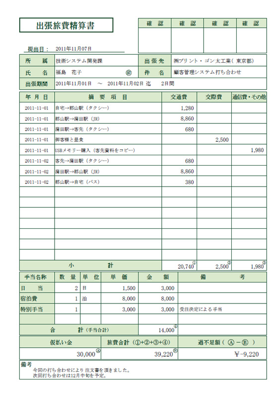 オーソドックスなフォーマットで計算は自動で計算されますのでアッと云う間に「旅費精算書」が作成できます。