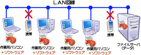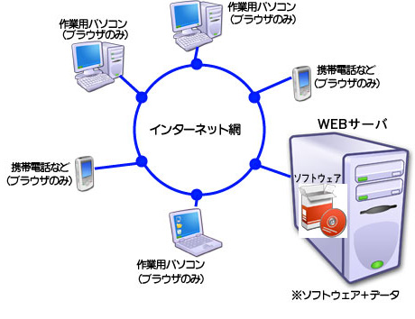 当然、ソフトウェアとデータはWEBサーバに一元化されますので、各作業用パソコンにソフトウェアのインストールは必用無くなるわけです。