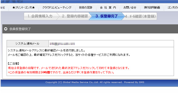 - 同時にご登録頂いた『システムメール』アドレスに本登録用の確認メールが送信されますので、24時間以内に本登録作業を完了されて下さい。