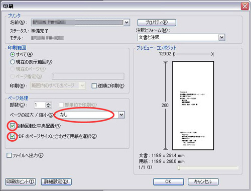 すると、下記のようなPDF印刷設定画面が現れますので、下記のような設定にして下さい。
